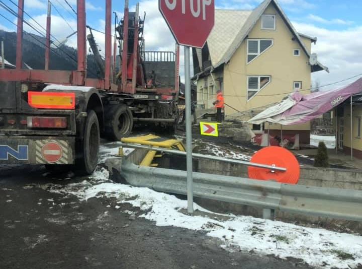 Accident în Câmpulung Moldovenesc. Un camion a rupt un parapet metalic, un stâlp din beton și un semn de circulație FOTO