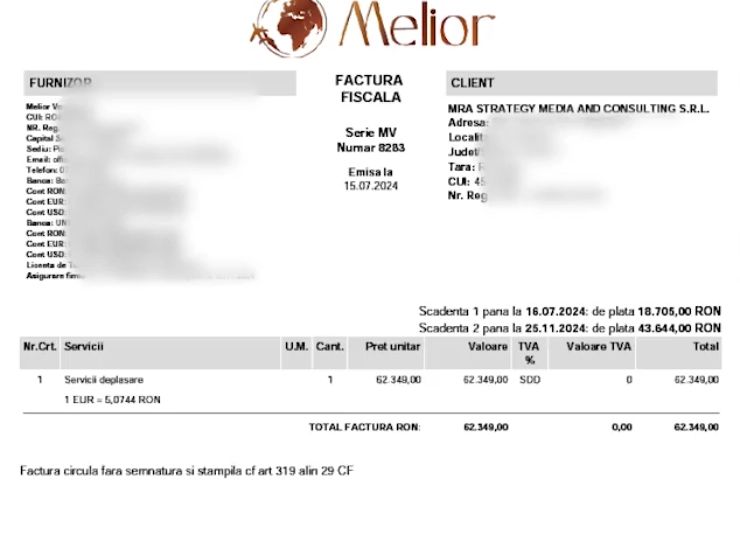 sursă: Recoder"Vreau să îmi dovediți de unde reiese că această firmă mi-a plătit vacanța”, a solicitat Anca Alexandrescu, prezentând și o factură reală, pe care a achitat-o aceleiași firme, dar nu numele schimbat de Melior, în 2024.