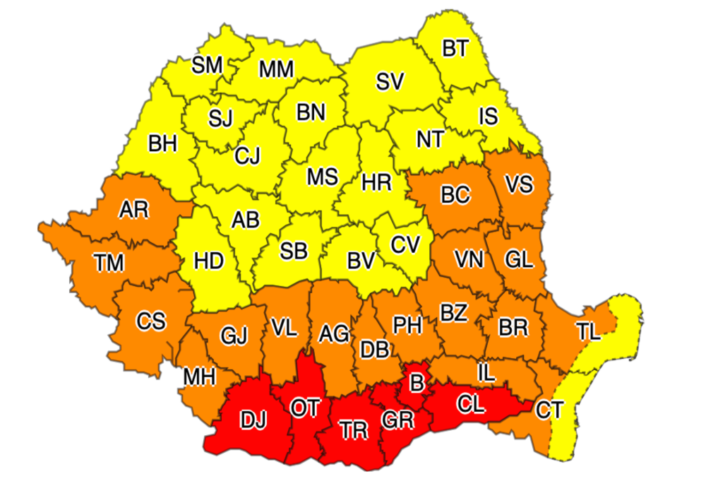 În județele Teleorman, Giurgiu, Ilfov, Călărași, Ialomița, Brăila, Galați, vestul județului Constanța și în municipiul București, se vor înregistra temperaturi maxime extreme de 40...42 de grade, iar disconfortul termic va fi deosebit de accentuat.