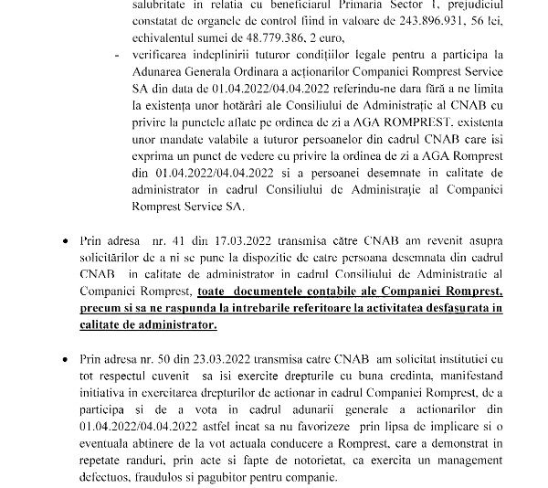 Ei reprezentau statul român, cele 10% în compania Romprest. Cu acordul dlul Dorbanțu au votat ca compania să nu încaseze dividende de la Romprest. Am prezentat aceste lucruri. În urma emisiunilor, DNA a solicitat hârtii, iar dl Dorobanțu a făcut acest denunț în iulie, la 4 zile după ce noi am făcut emisunea. În momentul în care și-au dat seama că sunt strânși cu ușa, au făcut acest denunț.