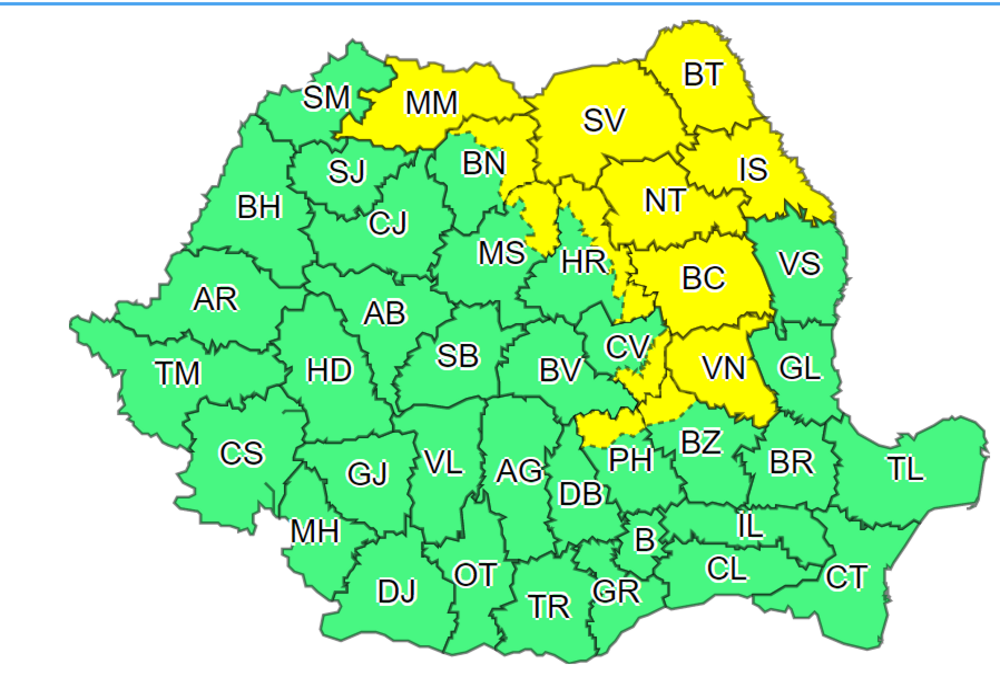 În intervalul menționat, local la munte, în Moldova și în Maramureș vor fi perioade cu instabilitate atmosferică accentuată, ce se va manifesta prin averse care vor avea și caracter torențial, descărcări electrice, intensificări ale vântului, vijelii și grindină. Cantitățile de apă vor depăși pe alocuri 25...40 l/mp.