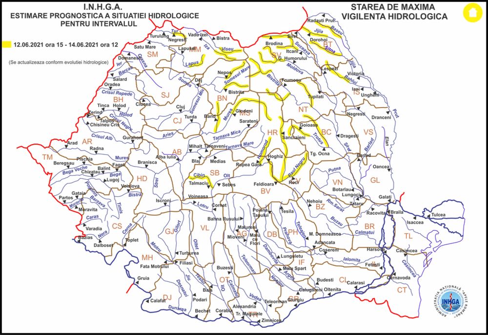 În intervalul 12.06.2021 ora 15:00 – 14.06.2021 ora 12:00 pe râurile din bazinele hidrografice: Vişeu, Iza, Lăpuş – bazine superioare şi afluenţi bazine mijlocii şi inferioare (judeţul Maramureş), Tur – bazin superior şi afluenţi bazin mijlociu şi inferior (judeţul Satu Mare), Someşul Mare – bazin superior şi afluenţi bazin mijlociu şi inferior (judeţul Bistriţa Năsăud), Mureş – bazin superior amonte S.H. Glodeni şi afluenţii aferenţi sectorului aval S.H. Glodeni – amonte S.H. Luduş (Harghita, Mureş şi Bistriţa Năsăud), Olt – bazin amonte S.H. Hoghiz şi afluenţii aferenţi sectorului aval S.H. Hoghiz – amonte confluenţă cu râul Lotru (judeţele: Harghita, Covasna, Braşov, Sibiu şi Vâlcea), Bistriţa – bazin superior şi afluenţi bazin mijlociu şi inferior (judeţele: Suceava, Harghita, Neamţ şi Bacău), Moldova – bazin superior şi afluenţi bazin mijlociu şi inferior (judeţele: Suceava şi Neamţ), Suceava – bazin superior şi afluenţi bazin mijlociu şi inferior (judeţul Suceava), Trotuş – bazin superior şi afluenţi bazin mijlociu şi inferior (judeţele: Harghita, Covasna, Neamţ, Bacău şi Vrancea), Jijia – bazin superior şi afluenţi bazin mijlociu şi inferior (judeţele: Botoşani şi Iaşi) şi afluenţii Prutului aferenţi sectorului amonte confluenţă Jijia (judeţele: Botoşani şi Iaşi).