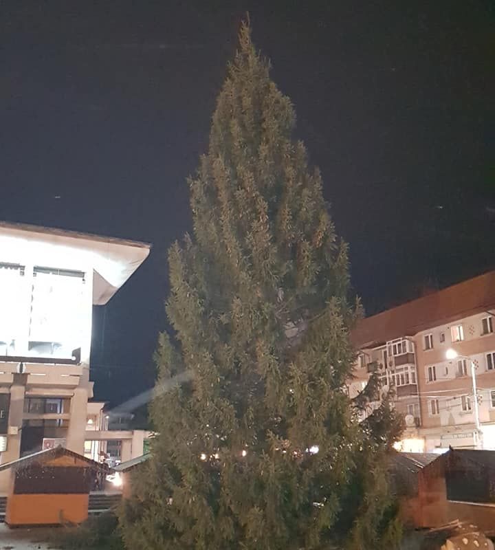 Bradul de Crăciun a fost montat vineri seară pe esplanada din fața Casei de Cultură. Molidul are o înălțime de 14 metri.