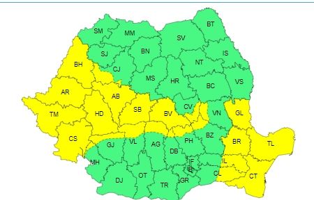 Avertizazrea cod galben este valabilă pentru judeţele Alba, Argeş, Arad, Bihor, Braşov, Buzău, Cluj, Caraş-Severin, Covasna, Dâmboviţa, Gorj, Hunedoara, Mehedinţi, Prahova, Sibiu, Timiş, Vâlcea şi Vrancea.