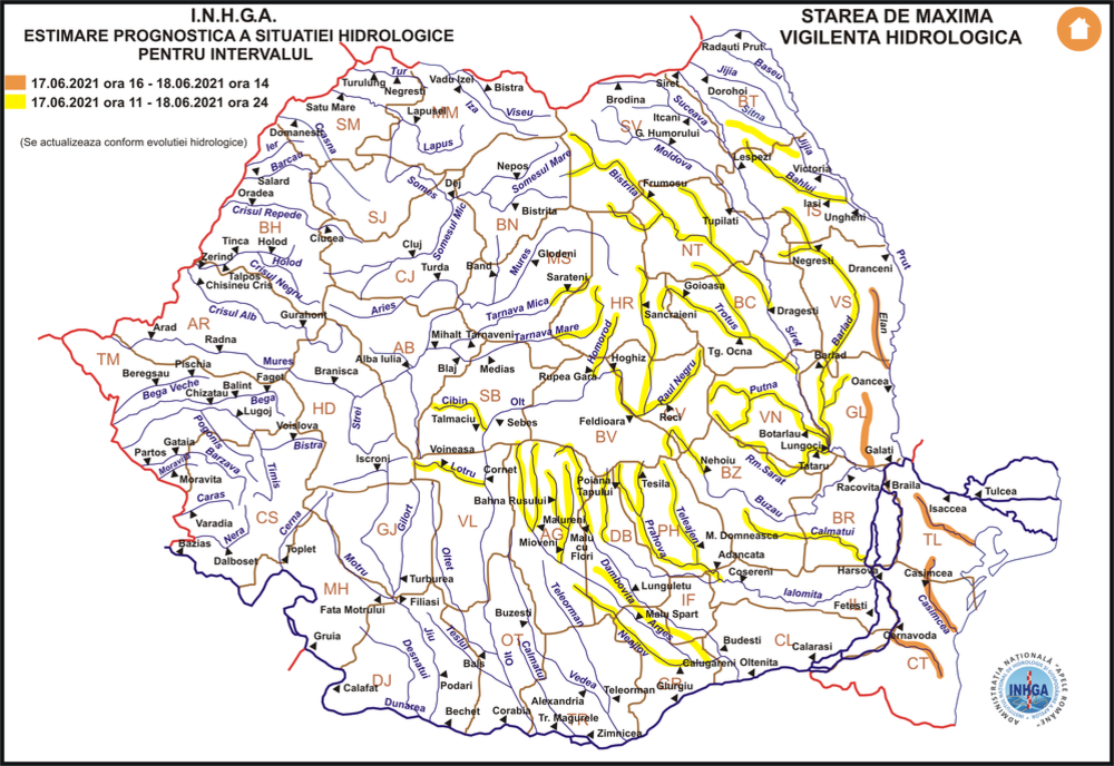 În intervalul 17.06.2021 ora 11:00 – 18.06.2021 ora 24:00 pe râurile din bazinele hidrografice: Târnava Mică – bazin superior şi afluenţi bazin mijlociu şi inferior, Târnava Mare – bazin superior şi afluenţi bazin mijlociu şi inferior (judeţele: Harghita, Mureş, Braşov, Sibiu şi Alba), Olt – bazin amonte S.H. Hoghiz şi afluenţii aferenţi sectorului aval S.H. Hoghiz – amonte Ac. Călimăneşti (judeţele: Harghita, Covasna, Braşov, Sibiu şi Vâlcea), Argeş – bazin superior şi afluenţi bazin mijlociu şi inferior (judeţele: Argeş, Dâmboviţa, Giurgiu, Teleorman şi Ilfov), Ialomiţa – bazin superior şi afluenţi bazin mijlociu şi inferior (judeţele: Dâmboviţa, Prahova şi Ialomiţa), Călmăţui (judeţele: Buzău şi Brăila), Buzӑu – bazin superior şi afluenţi bazin mijlociu şi inferior (judeţele: Braşov, Covasna, Buzӑu şi Prahova), Rm. Sărat (judeţele: Buzău şi Vrancea), Putna (judeţul Vrancea), Trotuş (judeţele: Harghita, Covasna, Neamţ, Bacău şi Vrancea), Bistriţa (judeţele: Suceava, Harghita, Neamţ şi Bacău), Bârlad (judeţele: Neamţ, Iaşi, Vaslui, Bacău, Vrancea şi Galaţi), Siret – afluenţii mici aferenţi sectorului aval confluenţă cu râul Suceava (judeţele: Suceava, Botoşani, Iaşi, Neamţ, Bacău, Vrancea şi Galaţi), Jijia – afluenţii aferenţi sectorului aval confluenţă cu râul Sitna (judeţele: Botoşani şi Iaşi), Prut – afluenţii aferenţi sectorului aval confluenţă cu râul Jijia (judeţele: Iaşi, Vaslui şi Galaţi) şi râurile din Dobrogea (judeţele: Constanţa şi Tulcea).