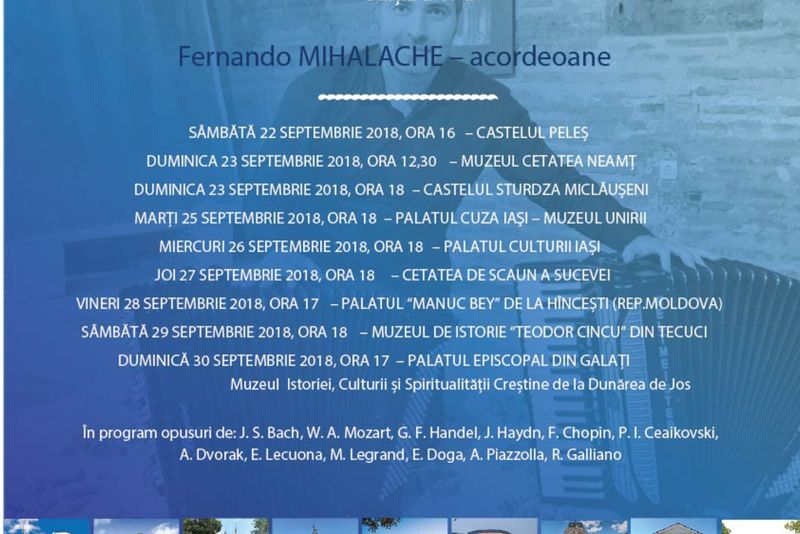 Fernando Mihalache este unul dintre puținii interpreți români ai acordeonului care au reușit să pătrundă pe scenele de concert. A obţinut titlul de doctor în muzică la Universitatea Natională de Muzică Bucureşti in anul 2011. Calitățile sale remarcabile îi permit să abordeze o mare varietate de genuri și stiluri muzicale. O recunoaștere a acestui fapt o constituie prezența sa pe scena Festivalului George Enescu, a Festivalul Jazz Blues& More,„The Sound of Spring”, etc.Unul dintre cele mai importante proiecte ale lui Fernando Mihalache este „Traffic Strings”, materializat cu un compact disc în 2009. Alături de vibrafonistul Alexandru Anastasiu, pune bazele „Accord Vibes”, un proiect de anvergură (acordeon şi vibrafon), unic în România. Un alt proiect interesant prin asocierea timbrală (flaut, acordeon, pian şi contrabas) cât şi prin repertoriul abordat este „Maxim Quartet”. Acum se află în fața primului turneu solo, o adevărată provocare artistică pe care nu trebuie să o ratați.Turneul “Muzica Palatelor României” va continua astfel: Palatul Manuc Bey de la Hîncești - Republica Moldova (vineri 28 sept., ora 17), Palatul “Teodor Cincu” – Muzeul de Istorie din Tecuci (sâmbătă 29 sept., ora 18), Palatul Episcopal din Galați - Muzeul Istoriei, Culturii și Spiritualității Creștine de la Dunărea de Jos (duminică 29 sept., ora 17.00).