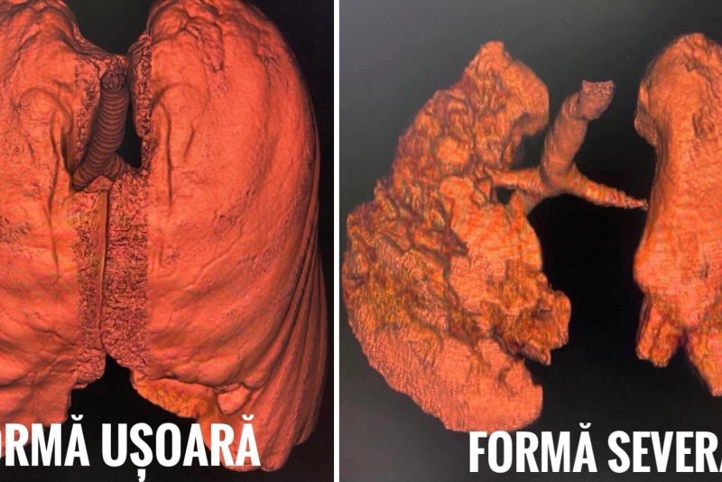 RO Vaccinare a postat două imagini reprezentând tomografii computerizate cu reconstrucție tridimensională a doi pacienți nevaccinați, bolnavi de COVID-19. Imaginile redau atât forma ușoară, cât și pe cea gravă a bolii.