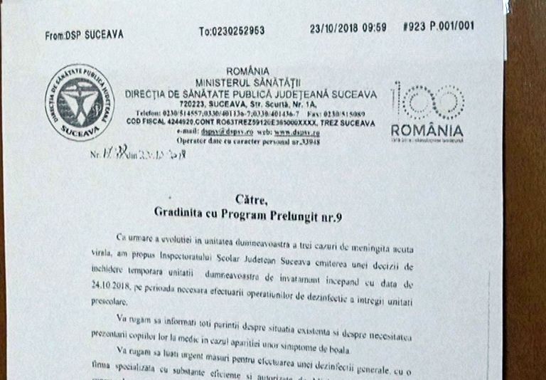 DSP Suceava a anunțat, vineri, că a crescut numărul copiilor bolnavi de meningită virală acută. Alți doi copii au fost internați în ultimele două zile la Spitalul Județean de Urgență „Sf. Ioan cel Nou” Suceava. Până în prezent numărul total de cazuri de meningită virală acută a ajuns la cinci. Cu toții sunt înscriști la Grădinița cu Program Prelungit nr. 9 „Princhindel” din cartierul Burdujeni al municipiului Suceava. Este cea mai mare grădiniță din municipiul Suceava.Joi, 25 octombrie, a fost efectuată dezinfectată clădirea grădiniței. DSP Suceava a anunțat că luni, 29 octombrie, vor fi recoltate probe de control. Ulterior, instituția va aprecia dacă va acorda avizul pentru redeschiderea unității.Primele rezultate parțiale au fost deja transmise de Centrul Regional de Sănătate Publică Iași. Conform DSP Suceava, cauza îmbolnăvirilor este un enterovirus Coxsackie. Este aceeași tulpină care a provocat si epidemia de meningita acută virală din anul 2012.