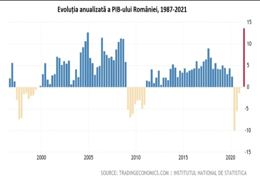 Economia României a crescut cu 13,6%, în ultimul an, și cu 1,8% în Trimestrul II din 2021, față de primul trimestru. Este cea mai mare creștere anuală de când există date privind PIB-ul (1987), dar ea se raportează la perioada stării de urgență, în care economia s-a oprit parțial.