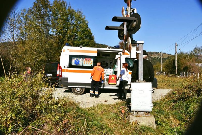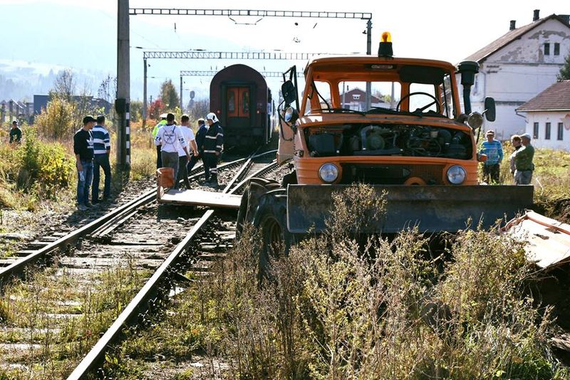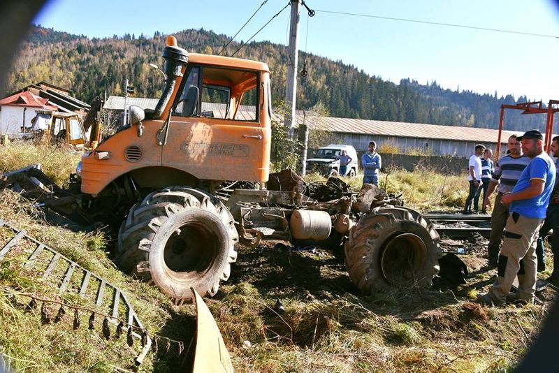 FOTO. Accident feroviar pe raza localității Vama. Două persoane au fost rănite după ce un tren a lovit un utilaj forestier