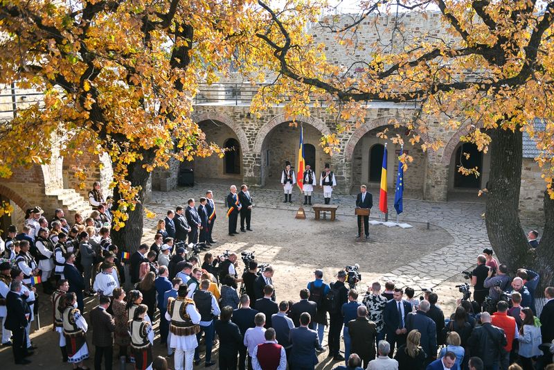 Președintele României, Klaus Iohannis, a oferit, miercuri, Drapelul Național Cetății de Scaun a Sucevei, fosta reședință a voievozilor Moldovei.
