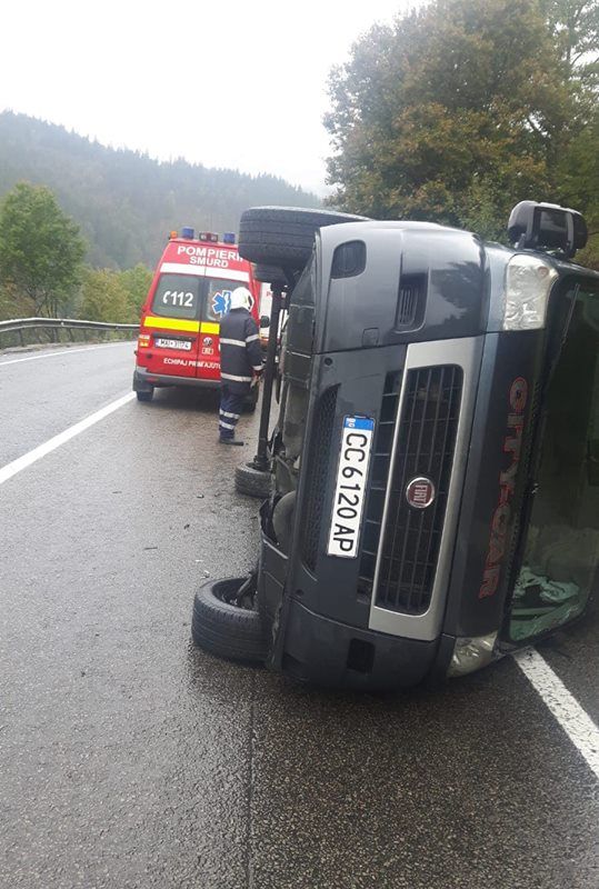 Accident rutier sâmbătă, în jurul orei 14.00, pe DN 17, pe raza localității Argestru, municipiul Vatra Dornei. Un microbuz cu nouă persoane s-a răsturnat pe partea carosabilă.
