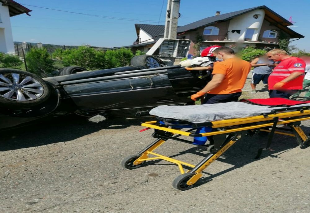 Mașină răsturnată la ieșire din Rădăuți! O femeie și un copil au ajuns la spital (FOTO)