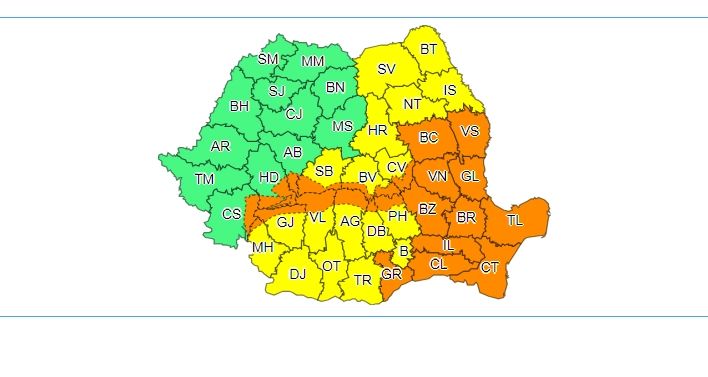 O avertizare cod portocaliu, valabilă în intervalul 25 noiembrie, ora 10:00 – 26 noiembrie, ora 18:00, vizează judeţele Giurgiu, Călăraşi, Ialomiţa, Brăila, Tulcea şi Constanţa, unde vor fi precipitaţii abundente, se vor acumula 50...60 l/mp şi izolat 70 l/mp.