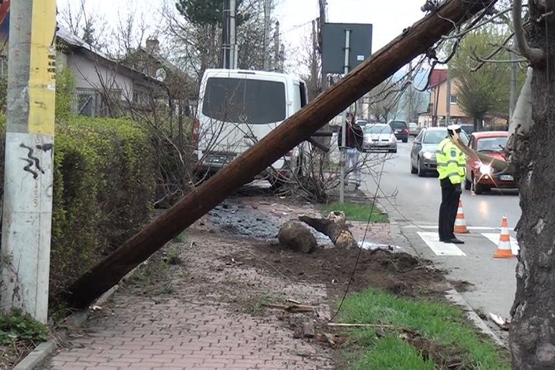 Accidentul a avut loc în cartierul Ițcani, din municipiul Suceava, vineri dimineață. Șoferul unei autoutilitare a pierdut controlul asupra direcției de mers, a pătruns cu autoutilitara pe trotuar unde a lovit un stâlp și a pus un copac la pământ.