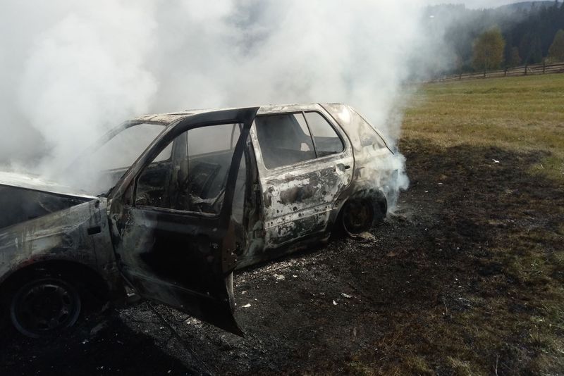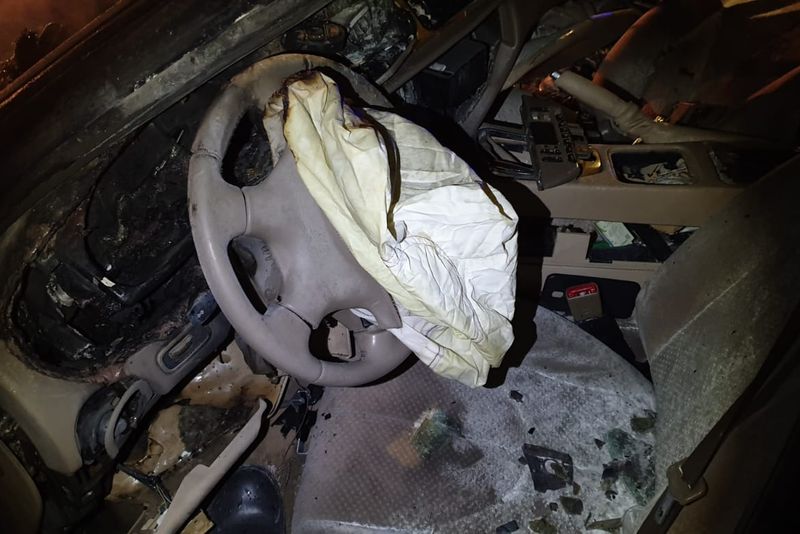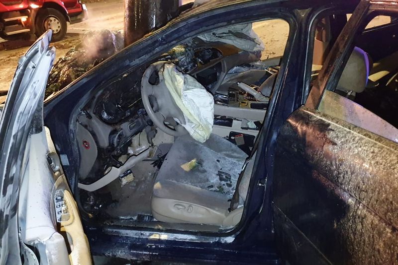 La sosirea echipajelor, ardea partea din față a autoturismului, cu pericol de propagare la întreaga mașină.Cele trei persoane care se aflau în autoturism s-au autoevacuat și au fost preluate de echipajele SAJ, sosite la fața locului. Toate cele trei persoane erau conștiente și cooperante.În urma incendiului au ars elemente combustibile din compartimentul motor și s-au degradat aproximativ 75% din autoturism și stâlpul de iluminat public.