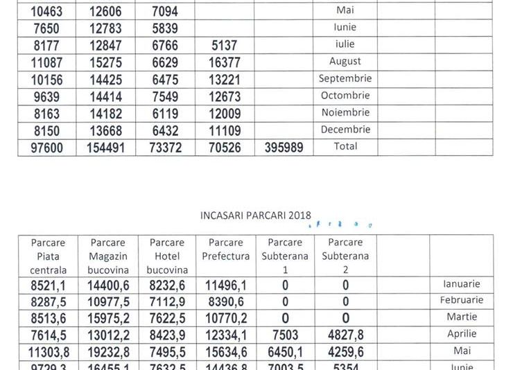 "În anul 2018 au fost încasări de 662.577 lei, față de anul 2017, cand s-au încasat 359.989 lei. Cea mai solicitată parcare este cea de la magazinul Bucovina, de unde s-au încasat 179.971 lei... În anul 2015, an fără parcometre, au fost tăiate chitanțe care au însumat 36.892 lei", a precizat Lucian Harșovschi.