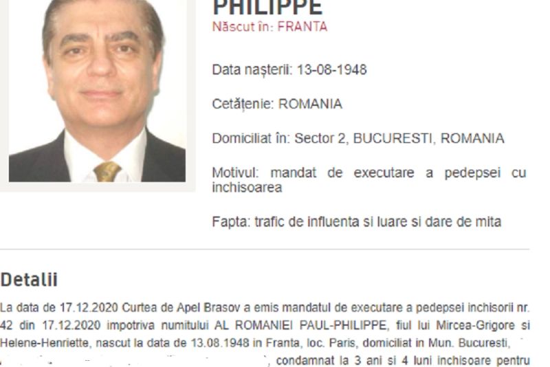 La data de 17 decembrie 2020, Curtea de Apel Brașov a emis mandatul de executare a pedepsei închisorii nr. 42 din 17.12.2020 împotriva numitului AL ROMANIEI PAUL-PHILIPPE, 72 ani, fiind condamnat la 3 ani și 4 luni închisoare, pentru săvârșirea infracțiunilor de cumparare de influență si complicitate la infracțiunea de abuz în serviciu contra intereselor publice, transmite Poliția Română.