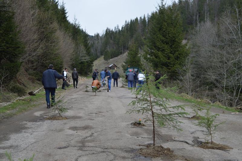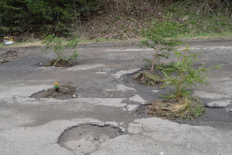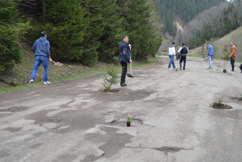 Protest inedit în ziua de Florii în localitatea suceveană Broșteni. Mai mulți localnici, nemulțumiți de starea deplorabilă în care se află drumul județean Frasin-Holda, au plantat flori și puieți în gropile din asfalt.