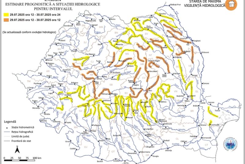 Astfel, în intervalul 29 iulie, ora 12:00 – 30 iulie, ora 12:00, este în vigoare Codul Portocaliu de inundaţii care va afecta anumite sectoare de râuri din judeţele: Harghita, Mureş, Bistriţa-Năsăud, Alba, Cluj, Sibiu, Hunedoara, Covasna, Braşov, Vâlcea, Suceava, Neamţ, Bacău, Vrancea, Vaslui, Iaşi şi Botoşani.