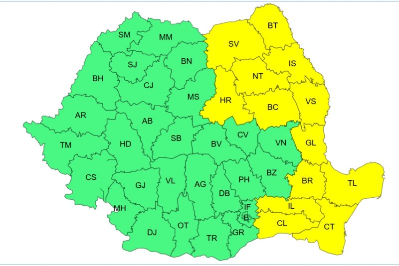 Potrivit lor, de sâmbătă seară, de la ora 20.00, până duminică la ora 10.00, va fi în vigoare o atenţionare meteorologică Cod galben. În Moldova, Dobrogea, Muntenia, Oltenia, Transilvania, Maramureş şi în nordul Crişanei vremea va fi geroasă. Temperaturile minime se vor situa în general între -20 şi -10 grade.