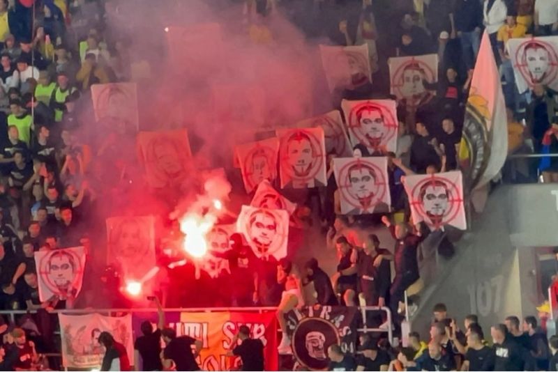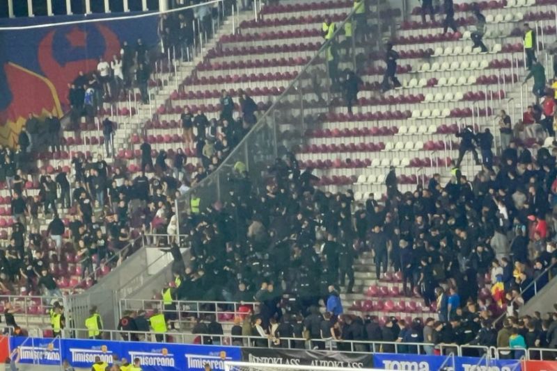 Cei aproximativ 300 de suporteri bosniaci au sărit la bătaie cu fanii tricolori. Cele două grupuri au aruncat cu scaune, torţe şi au fost despărţite doar de un zid protector subţire. Jandarmii au intervenit rapid, în forţă, şi au împiedicat ca suporterii rivali să ajungă faţă în faţă. Zeci de pumni au fost împărţiţi la capătul peretului, printr-o breşă.