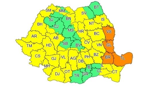 În județele Tulcea, Galați, Brăila și Vaslui vor fi averse torențiale, descărcări electrice, intensificări ale vântului și izolat grindină. Cantitățile de apă vor depăși 40...60 l/mp.