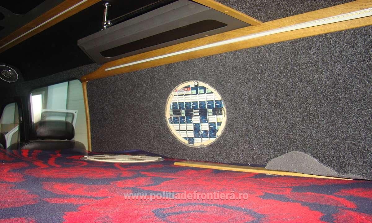 Polițiștii de frontieră și vameșii de la Siret au descoperit țigări de contrabandă ascunse în pereții unui microbuz.