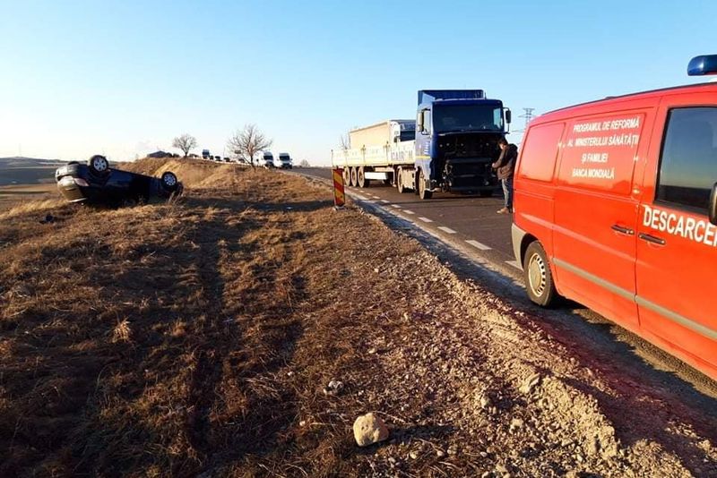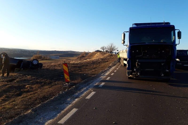 Un autoturism răsturnat și două persoane la spital, după ce un șofer a intrat într-o depășire riscantă FOTO