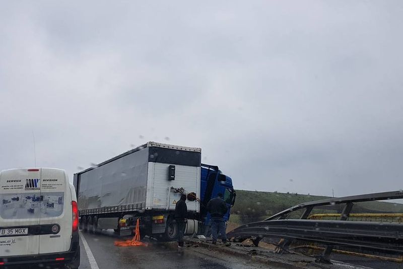Accident rutier pe DN 17, pe raza localității Stroiești, marți după-amiază. Un TIR scăpat de sub control a intrat în parapetul de pe marginea drumului.