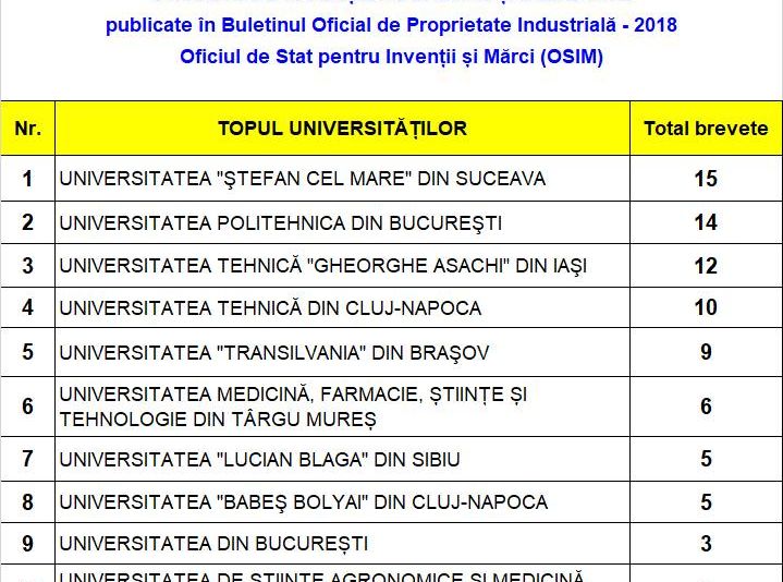 Universitatea "Ștefan cel Mare" din Suceava se situează pe primul loc în topul universităților românești alcătuit pe baza brevetelor de invenții acordate în anul 2018 de Oficiul de Stat pentru Invenții și Mărci (OSIM) din România.Astfel, OSIM a acordat USV Suceava un număr de 15 brevete de invenție, rezultat care clasează universitatea pe primul loc între instituțiile de învățământ superior din țară, aceasta fiind urmată de Universitatea Politehnică din București, cu 14 brevete, Universitatea Tehnică Gheorghe Asachi din Iași, cu 12 brevete și Universitatea Tehnică din Cluj Napoca, cu zece brevete.În tabelul alăturat prezentăm primele zece universități românești din topul alcătuit pe baza brevetelor de invenții acordate în 2018 de OSIM.