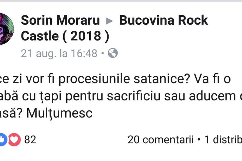 Pagina de pe Facebook a evenimentului Bucovina Rock Castle 2018 s-a umplut de glume după ce în mass-media au apărut informații cu privire la faptul că mai multe persoane ar fi cerut interzicerea festivalului. Organizatorii erau acuzați inclusiv de satanism.Bucovina Rock Castle începe vineri, 24 august. Începând cu ora 16.30 au loc concertele pe scena a doua, pentru trupele începătoare. Vor cânta Lexem, Linear Disorder și Nightrain.Pe scena principală concertele încep de la ora 19.00. Vor cânta Relative, Roadkil Soda, Dirty Shirt, Implant pentru Refuz și De Staat din Olanda.
