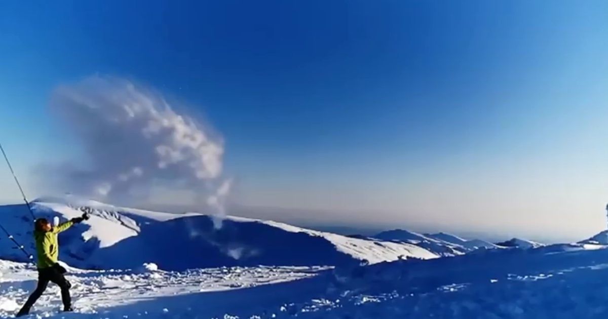 Desigur este vorba de o glumă, dar imaginile sunt cât se poate de reale. La 2507 m altitudine, cu cer senin( cu temperaturi de multe grade sub zero) și vânt nu foarte puternic, cei de la stația de la Vârful Omu, din Bucegi, nu au făcut decât să scoată afară o cană de apă fiartă, pe care au aruncat-o pur și simplu în atmosferă. Rezultatul a fost cât se poate de spectaculos. Instantaneu se formează un nor alb ce începe să se deplasaze către zonele mai joase. Imaginile vorbesc de la sine, și pe cât de simplu este experimentul pe atât de mult succes are filmarea, realizată în slow motion.