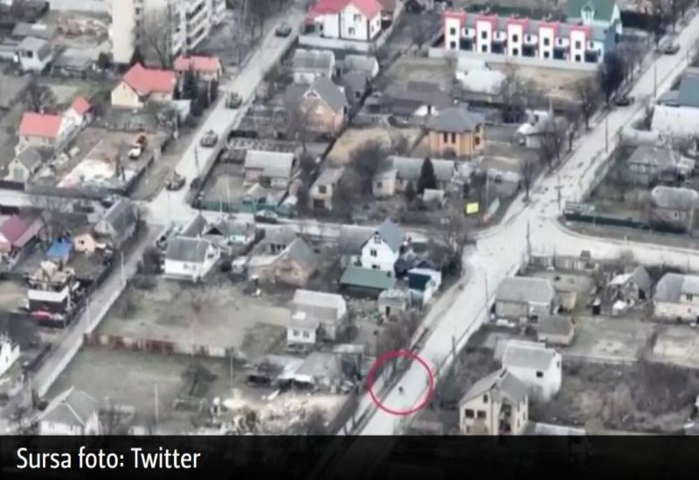 Noi imagini filmate din dronă arată momentul în care forțele rusești trag asupra unui biciclist în localitatea Bucha, pe strada Iablunska, locul unde au fost descoperite mai multe cadavre de civili în momentul în care militarii ucraineni au intrat în oraș, după retragerea rușilor.