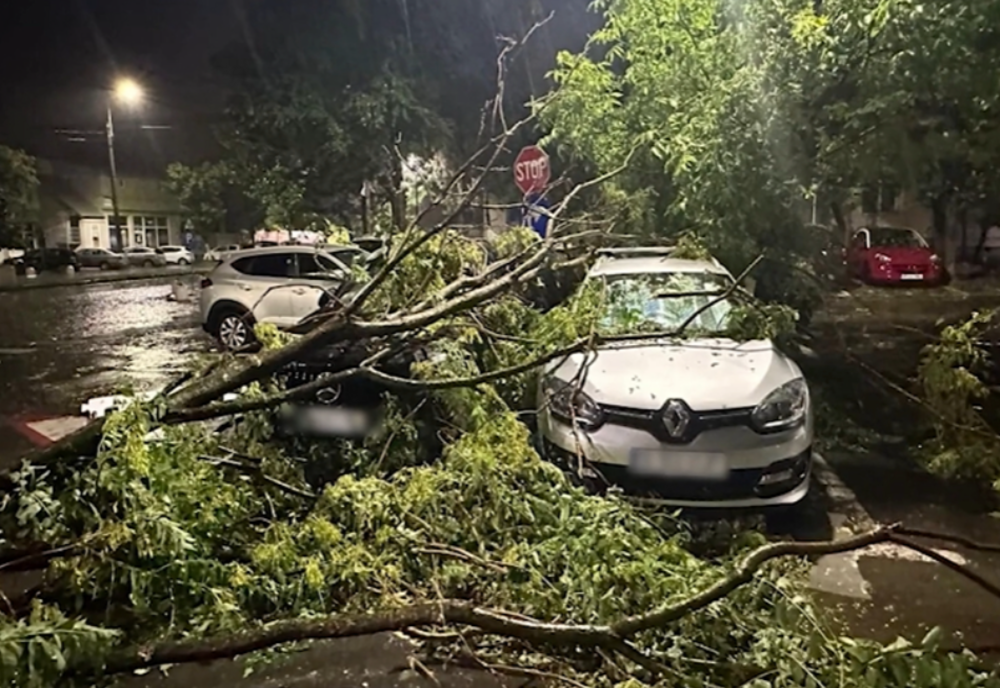 Rafalele violente de vânt au făcut prăpăd în București. Zeci de copaci au fost doborâți, iar 70 de mașini au fost distruse. Un copac uriaș a căzut peste două mașini parcate în curtea unui bloc din Sectorul 1 al Capitalei.