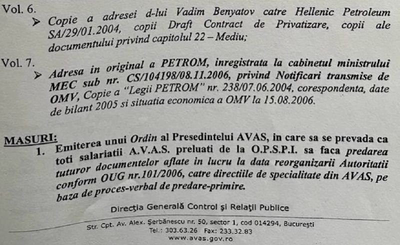 Volumul 5: Corespondenta la Consiliul COncurenței, adresa originala catre dl Mucea, adresata premierului C.P.Tariceanu, copie ordin de transmitere dividende, respectiv 854.954.009.503 lei, adresa originală catre Michael Guest, orginal scrisoare intenție Aqua Group, adresa Petrom privind notificari ale OMV.