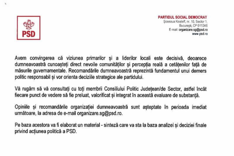 „Așteptăm, în egală măsură, perspectiva dumneavoastră asupra obiectivelor social-democrate esențiale pe care PSD trebuie să le promoveze și să le apere în actuala guvernare, precum și asupra direcției de urmat în situația în care partenerii de coaliție nu vor ține cont de aceste priorități ale electoratului PSD.”, se arată în scrisoare.