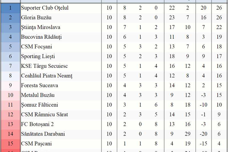 Golurile formației Gloria Buzău a fost marcate de Dragut ('11) și Petre ('60).După această înfrângere Bucovina Rădăuți a coborât de pe podium pe locul al patrulea. Pe locul al treilea a urcat Știința Miroslava care a învins Foresta Suceava cu 4-0. Primele două poziții sunt ocupate, la egalitate de puncte, de formațiile din Galați și Buzău.