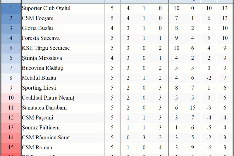 , în minutul 18, cu un șut de pe partea dreaptă. Chiar dacă rădăuțenii u dominat apoi jocul, căutând egalarea, Oțelul a reușit să țină de scor și a plecat cu toate cele trei puncte.În primele cinci etape Bucovina Rădăuți a bifat trei victorii și două înfrângeri, cu un golaveraj echilibrat: cinci goluri înscrise și cinci primite. Cu nouă puncte, Bucovina Rădăuți se află pe locul șapte în clasamentul seriei.În următoarea etapă, sâmbătă, 29 septembrie, Bucovina Rădăuți are programată o partidă în deplasare, cu Știința Miroslava.